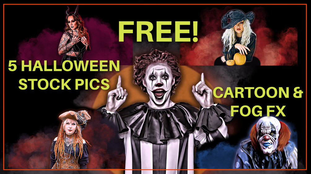 5 high quality beautiful photos that have been edited to look like a Halloween cartoon style with fog effects.